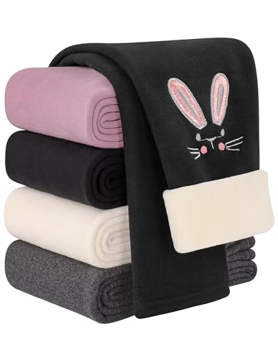 Auranso Girls Fleece Lined Thermal Sherpa-Lined Leggings Cotton Kids Winter Thick Warm Cartoon Bunny Embroidery Trousers Black, 8-9 Years