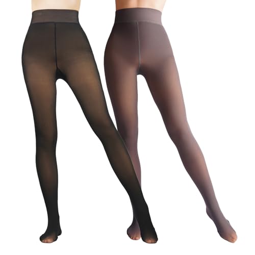 Caprilite 2 Pairs Women Fleece Lined Tights-Fake Translucent Leggings High Waist Pantyhose Sheer Thick Warm Tights For Women, Black+grey, Small
