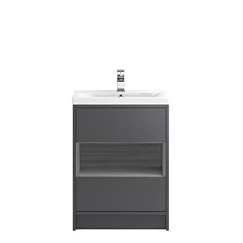 Hudson Reed CST876D Coast Modern Bathroom Floor Standing Vanity Unit with Thin-Edge Ceramic Basin, 2 Drawer 1 Open Shelf Unit, 600mm, Gloss Grey/Anthracite