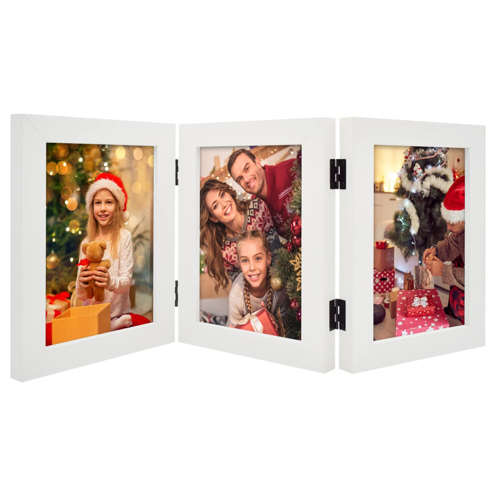 golden State Art, 5x7 Three Picture Frame Trifold Hinged Photo Frame with 3 Openings, Desk Top Family Picture collage, with Real glass (White, 1-Pack)