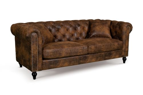 Lovesofas Brown Chesterfield Style Sofa 3 Seater – Faux Leather Tan Sofa with Accent Cushions, Button Detailing & Solid Wood Frame – Classic Three Seat in Faux Leather for Lounge, Office or Club