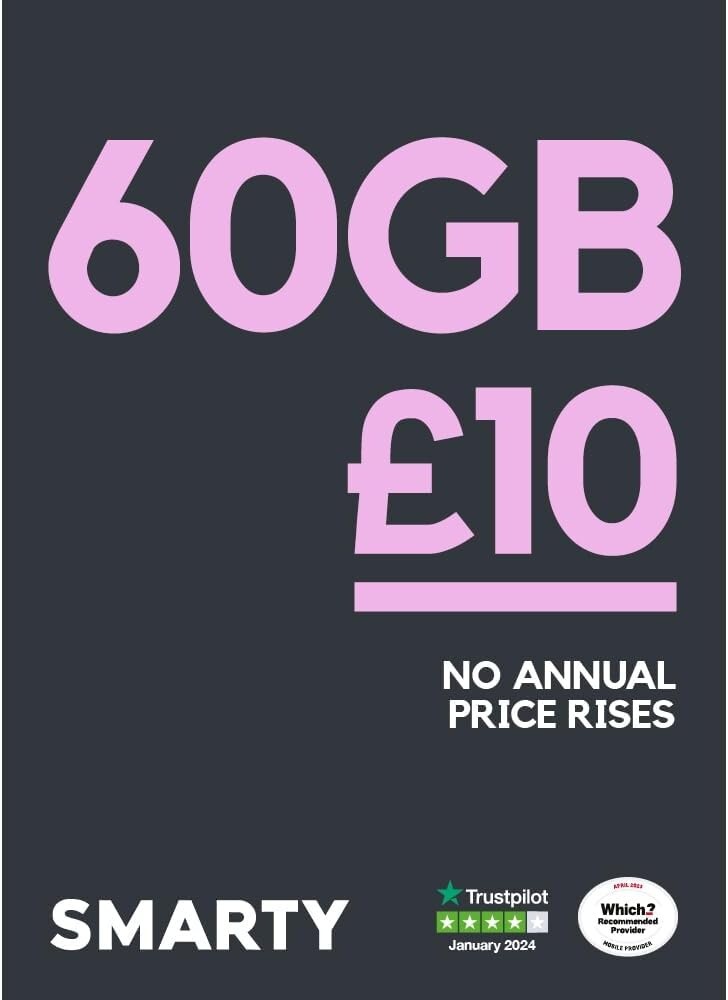 NEW Smarty sim card, 60GB Data for £10 + Europe roaming Pay & Go - Three 4G 5G