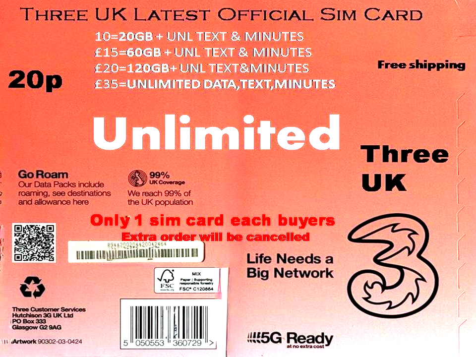 Three Sim Card 3g PAYG UK Network Unlimited Data Mins Text New buy 20 penny