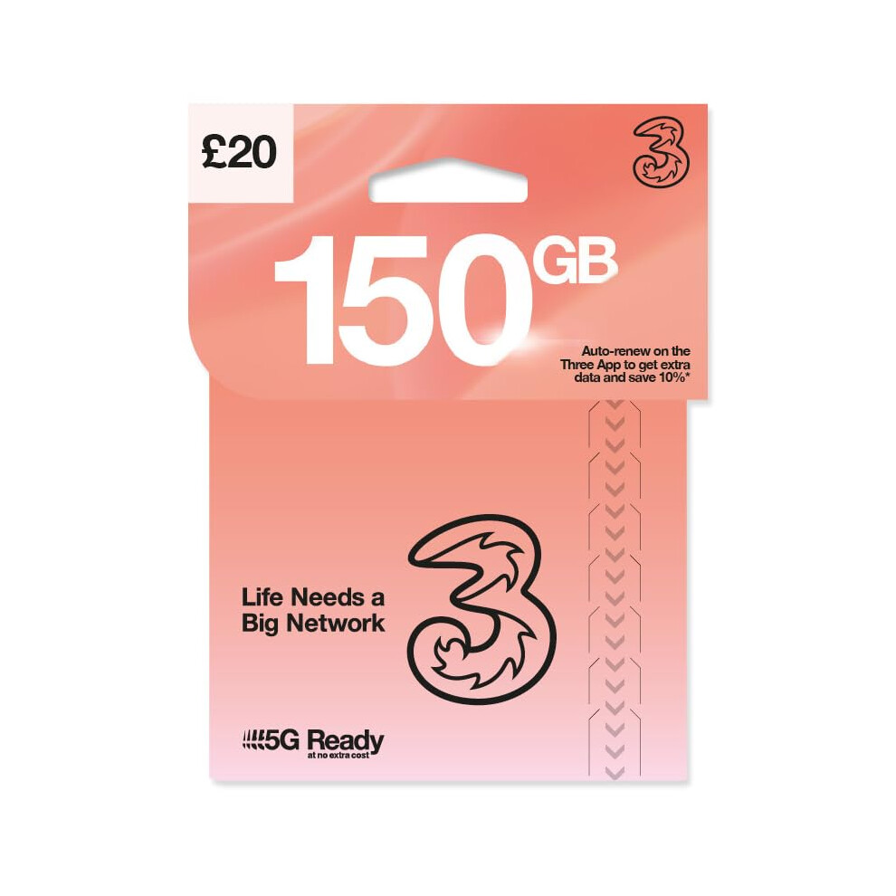 Three 4G/5G SIM Card UK PAYG £10 Bundle 40GB Data Unlimited Texts Mins
