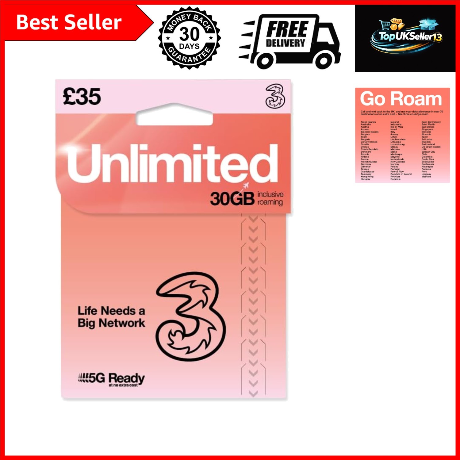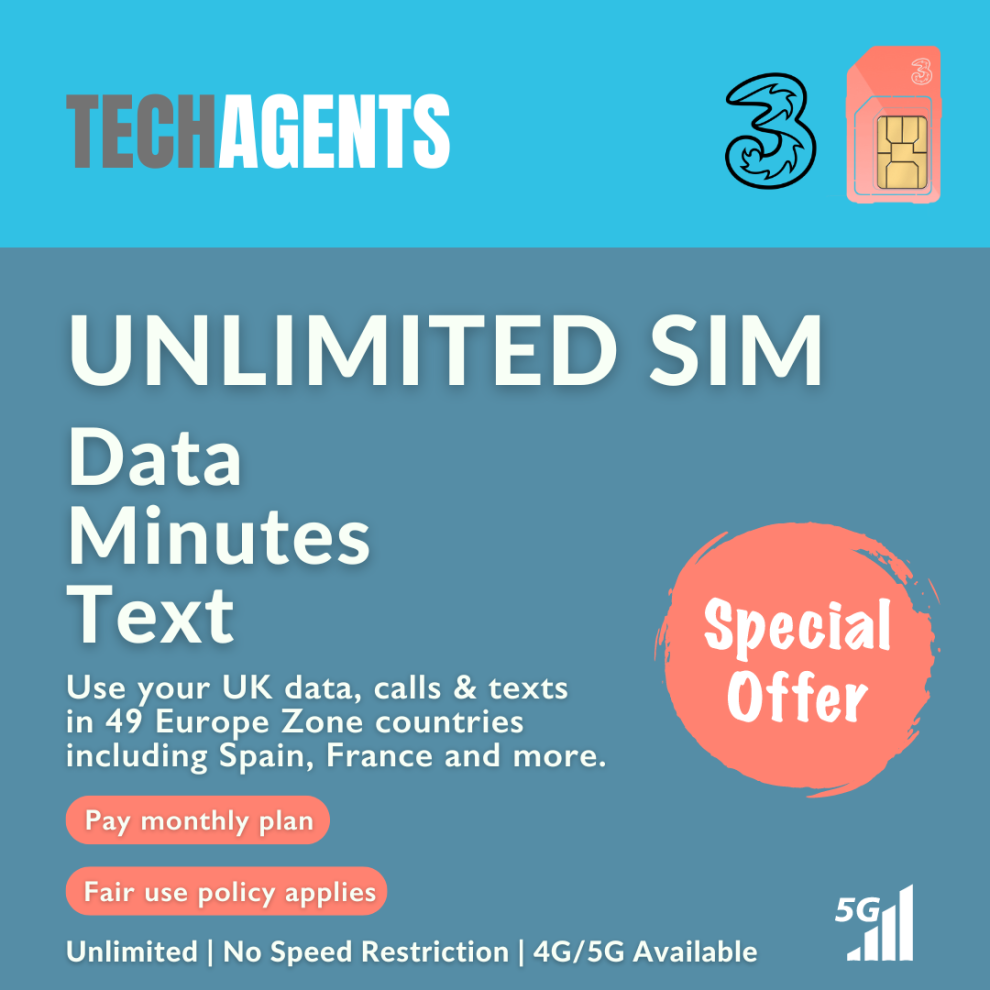 THREE 4G/5G SIM Card - Unlimited Data & 30GB Roaming for £35 - Easy Activation