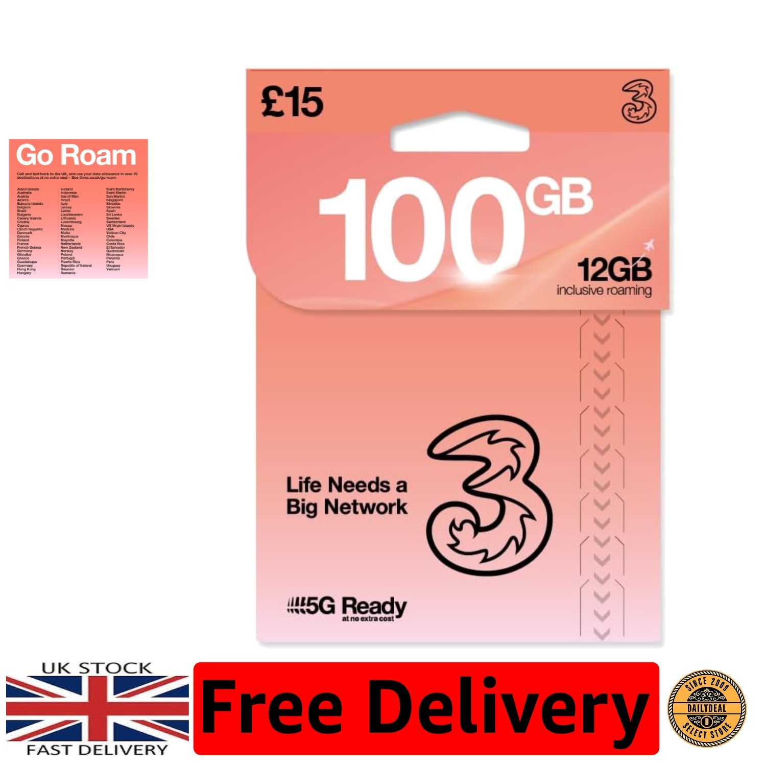 THREE 4G/5G SIM Card UK & ROAM FREE in over 70 destinations - PREPAID PAYG 15 Bundle - 75GB + (25GB FREE DATA) Unltd Texts & Mins - ROAMING ALLOWANC