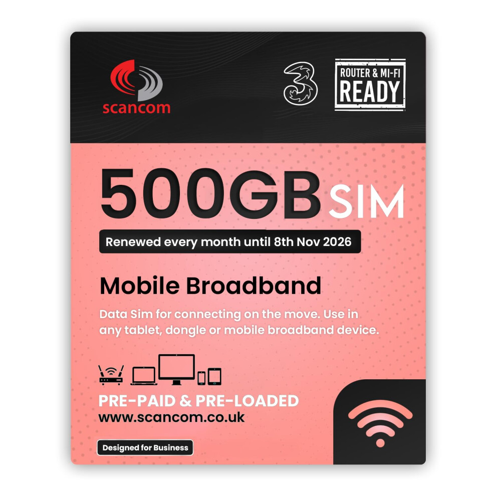 Three 500GB Data SIM Card – for Portable WiFi, Routers & Phones – Preloaded Monthly Until November 2027 – Dual Network (Three & Vodafone) Stronger Coverage