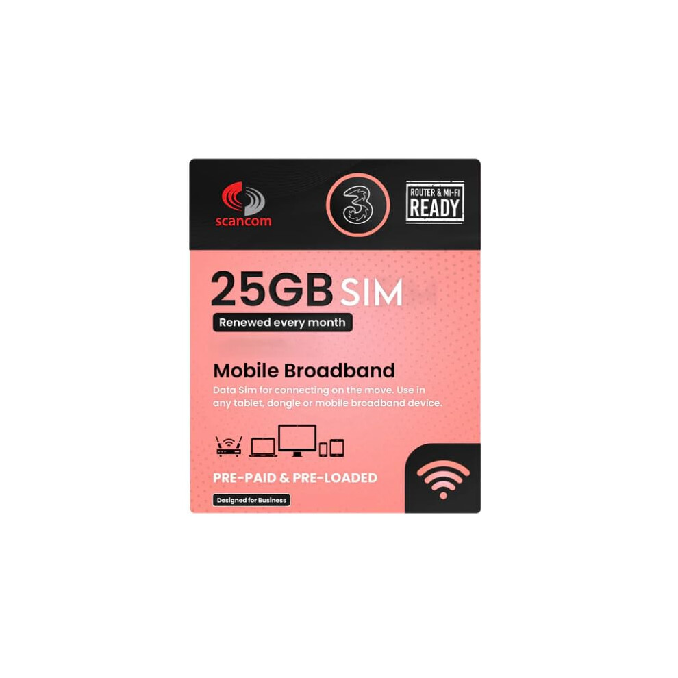 Three 25GB Data SIM - Uncapped 5G - Preloaded MONTHLY Until June 2026 - Plug & Play for Routers & Phones - Access to Three & Vodafone - Connects to t