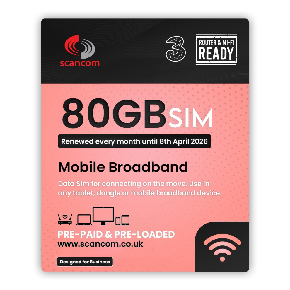 Three 80GB Data SIM Card – for Portable WiFi, Routers & Phones – Preloaded Monthly Until January 2027 – Dual Network (Three & Vodafone) Stronger Coverage