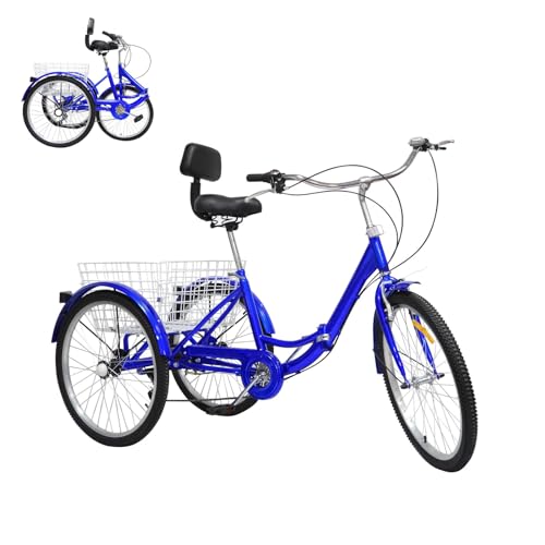 24 Inch Adult Tricycle 6 Speed with Rear Basket, Adjustable Handlebar, Low Step Frame, High Carbon Steel, Locking Brake, Lights, Stable Three Wheel Bike for Shopping, Men Women Elderly, Eco Friendly