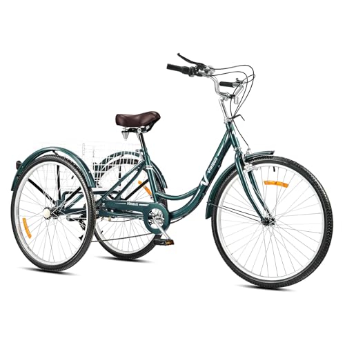 VIRIBUS 26 Inch Adult Tricycle, 7 Speed Adult Trike 3 Wheel Cargo Bike with Basket & 205 kg Cap for Men Women Seniors, Adjustable Three Wheel Bike Cruiser Bicycle for Shopping Cycling Pedalling, Green