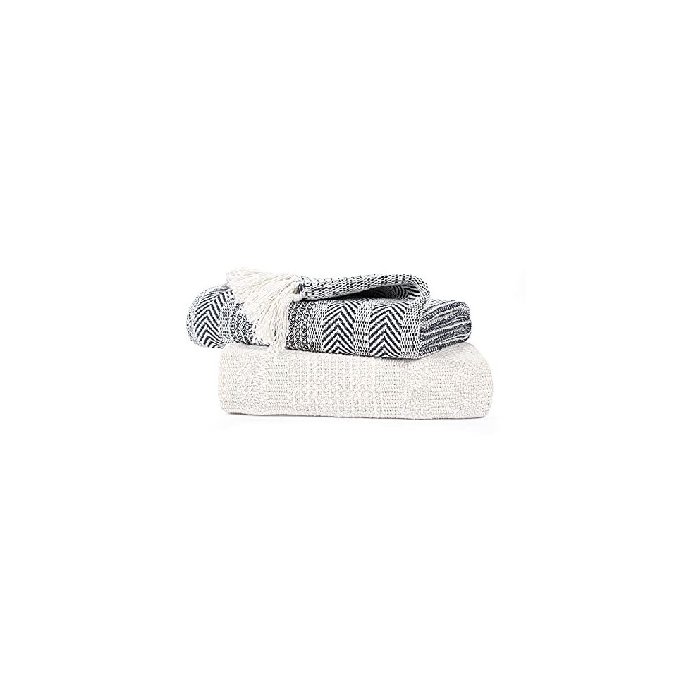 EHC Premium Pack of 2 Cross-Stitch Throws for Sofa/Chair Blanket, 125 x150 cm - Navy Blue/Ivory