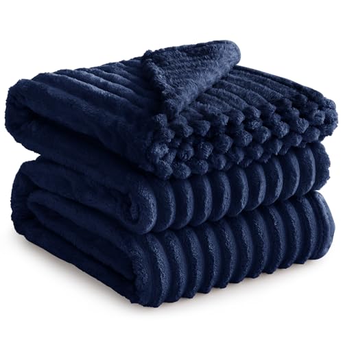 RUIKASI Fleece Throw Blanket for Sofa - King Size Fluffy Navy Blue Throws for Sofas Extra Large, Soft Warm Blanket Throw for Couch, Luxury Decorative Ribbed Bed Blanket 220x240cm