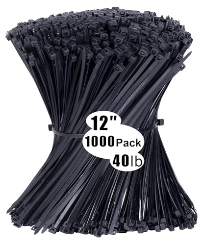 Cable Ties 1000 Pack,12 inch Zip Ties Black, 300 x 3.6mm Nylon Ties 40lb Tensile Strength with UV Resistant, Plastic Tie Wraps Self Locking Large Heavy Duty Cable Wrap for Workshop Indoor and Outdoor