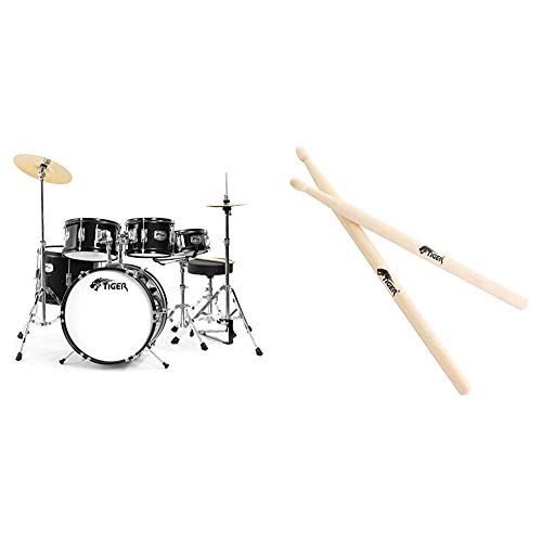 Tiger JDS14-BK 5 Piece Junior Drum Kit – Black Kids Drum Kit, Ages 3 – 10 Years + Tiger Junior Drumsticks - Childrens Drum Sticks for Junior Drum Kits - Pair