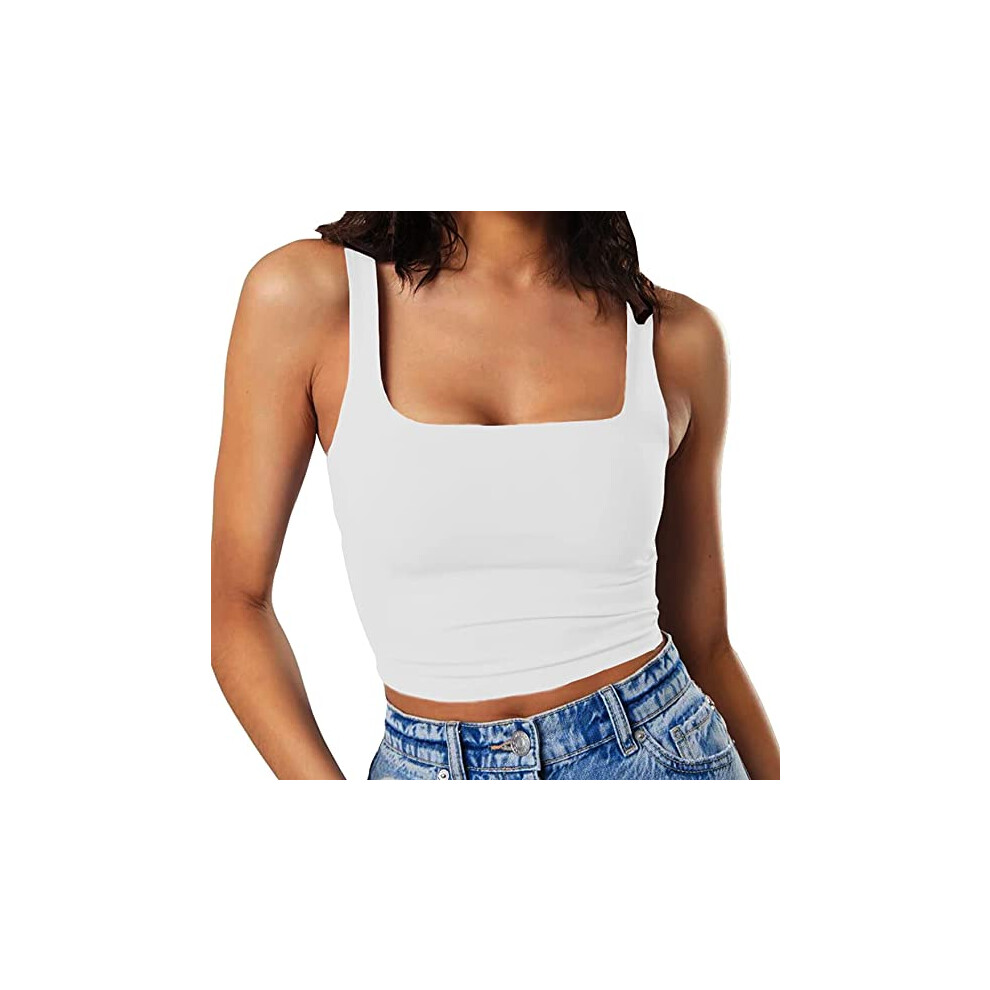 Women's Square Neck Crop Top, Removable Pads Sleeveless Tank Vest, Body Contour Double Lined Tight Fit Top with Wide Straps, Light Support for Daily
