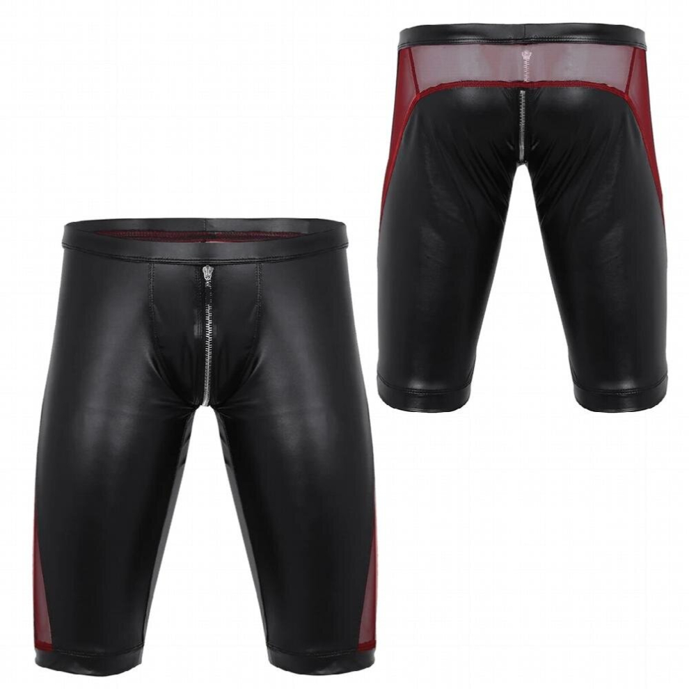 Mens Erotic Lingerie Leather Tight Boxer Shorts for Sex Zipper Crotch Mesh Splice Low Rise Slim Fit Festivals Sexy Panties