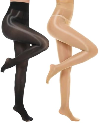 BAOKELAN Women Oily Tights Sheer Shiny Tights Control Top Tight Sexy Silk High Waist Pantyhose Black+Nude S-L
