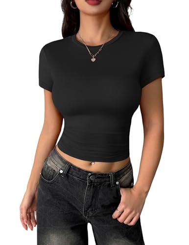 Zeagoo Women's Tight Top Short Sleeve Crop Tops Crew Neck Basic Solid T Shirt Stretch Fitted Tshirt Summer Streetwear Black M