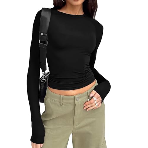 3 Pack Women Basic Long Sleeve Crop Tops Solid Y2k Going Out Tee Shirt Casual Crew Neck Tight Top Black