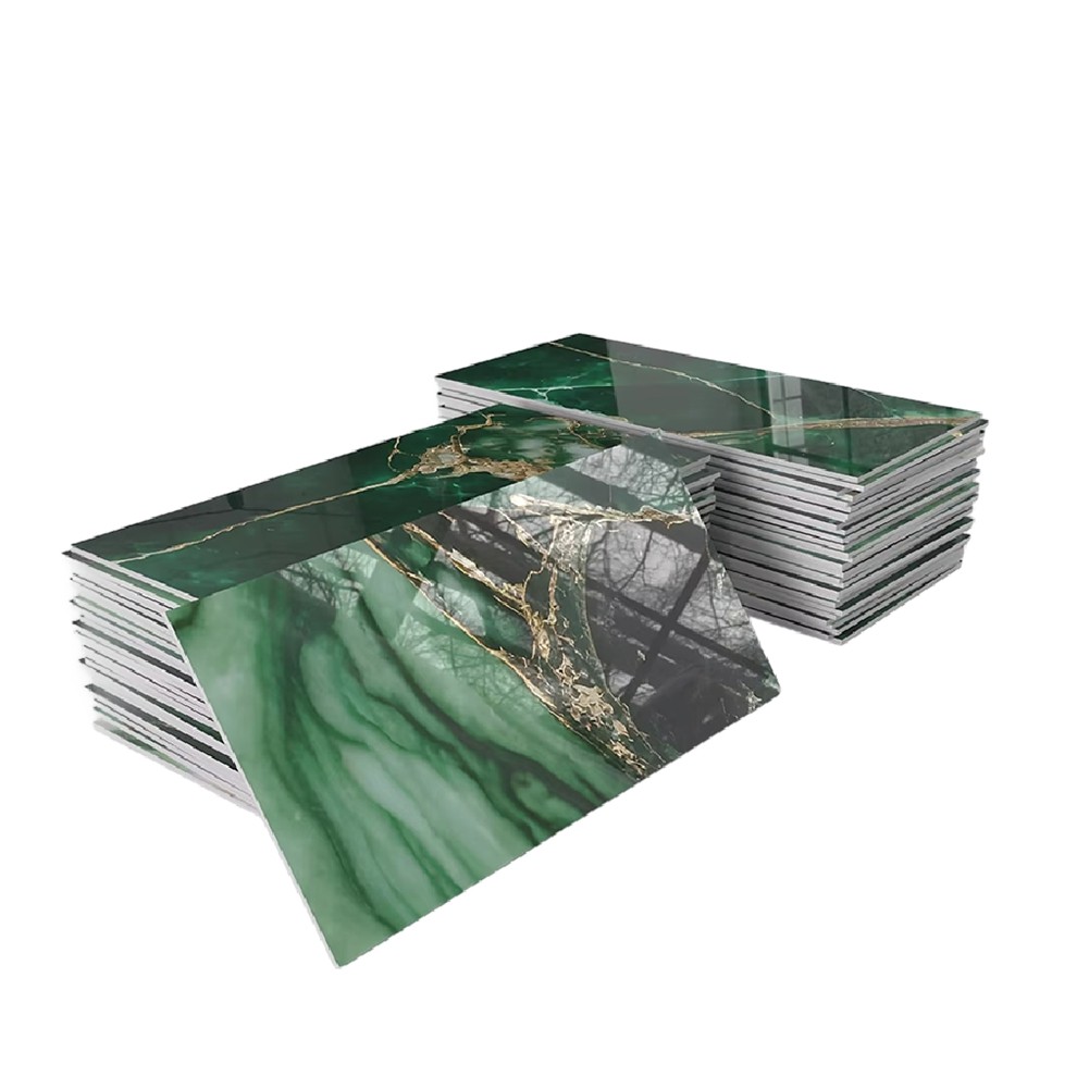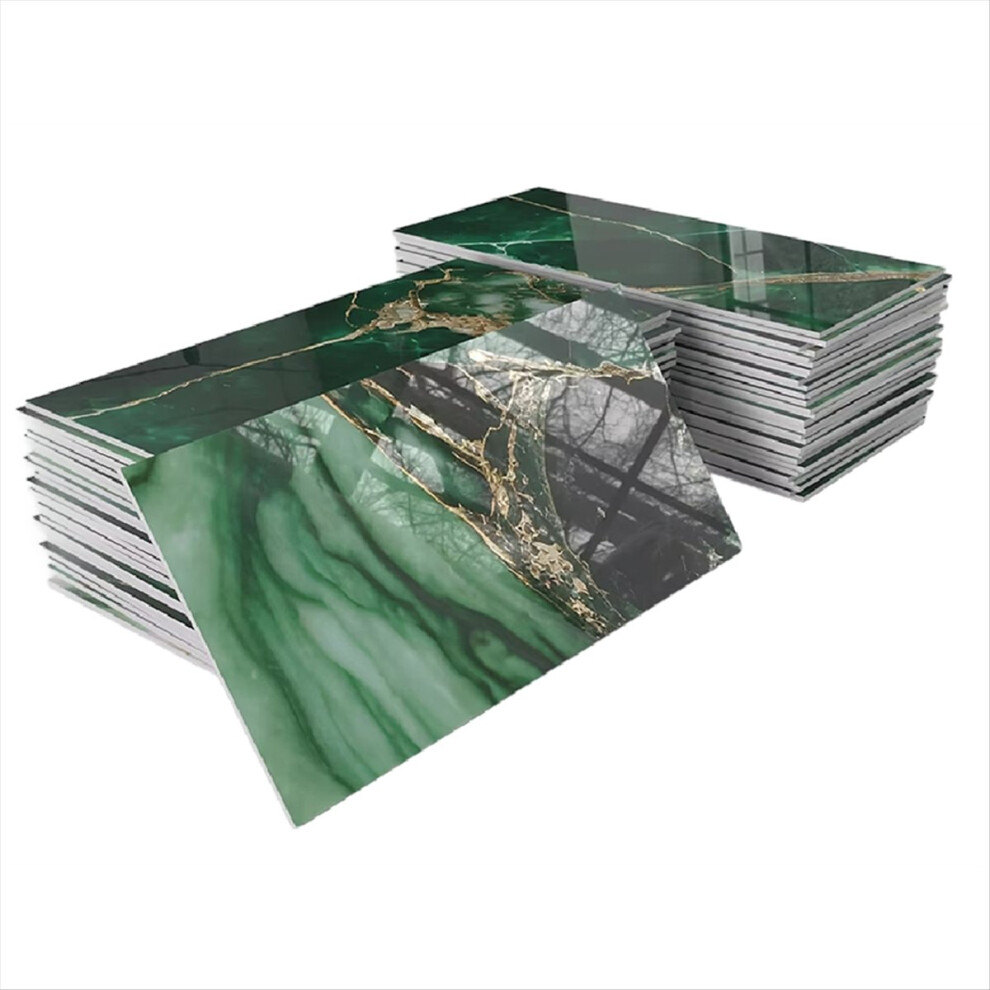 32Pcs Thick PET Glossy Subway Tile Sticker,4in X 8in Peel and Stick Backsplash Wall Tiles,Golden Veined Emerald Marble