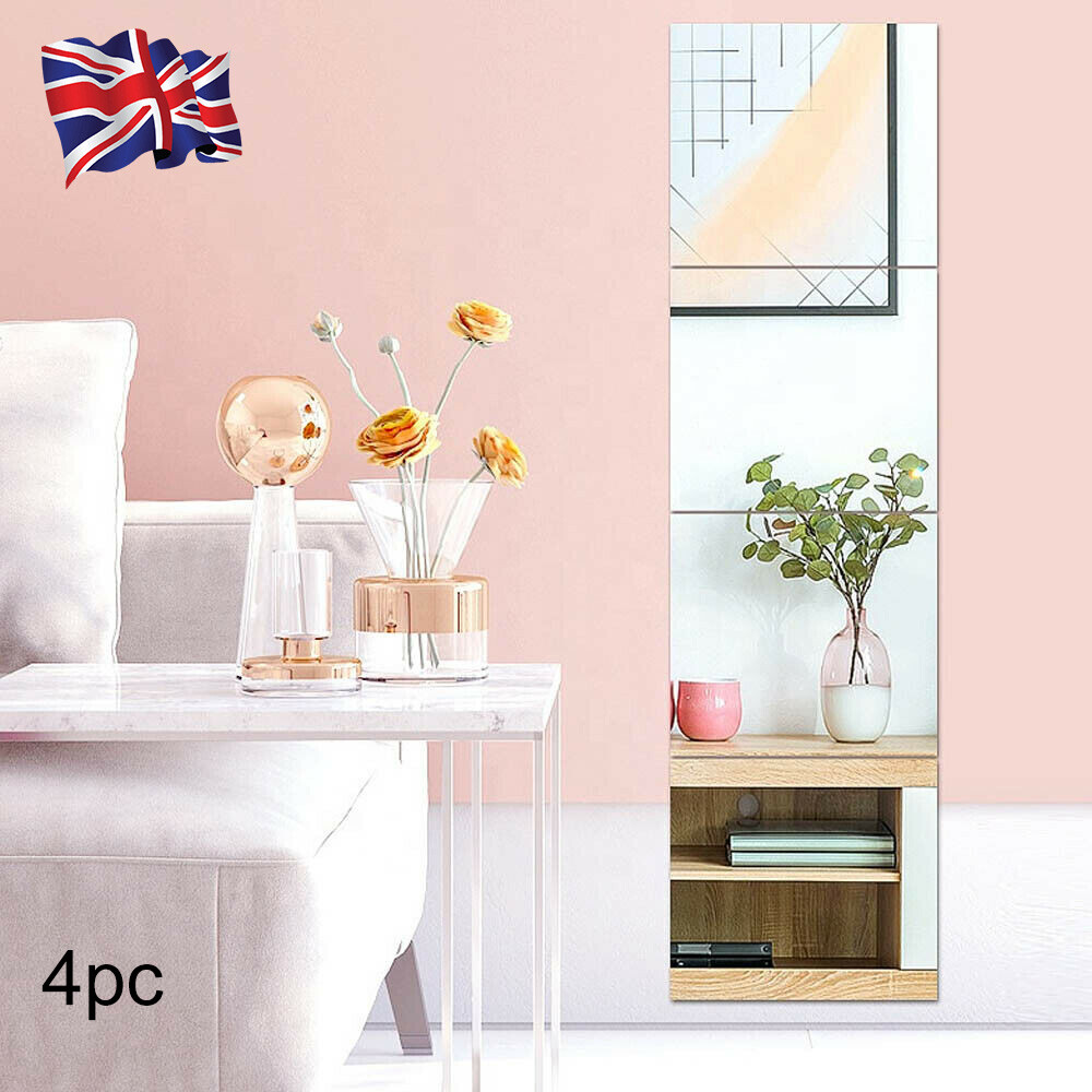 4Pcs Mirror Tile Wall Sticker Square Self Adhesive Stick On Art Room Decor UK