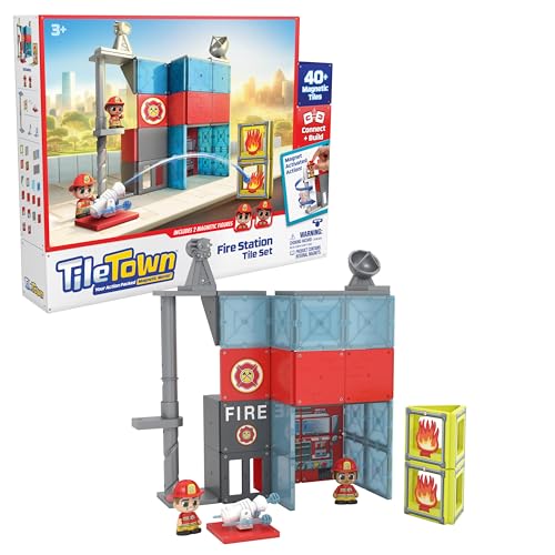 Tile Town Fire House Magnetic Tiles Construction Building Playset + Figures, Kids 3-5+, New ACTION TILES for Action Play, Realistic Builds, STEM Creative Toy, Great Gift for Boys & Girls