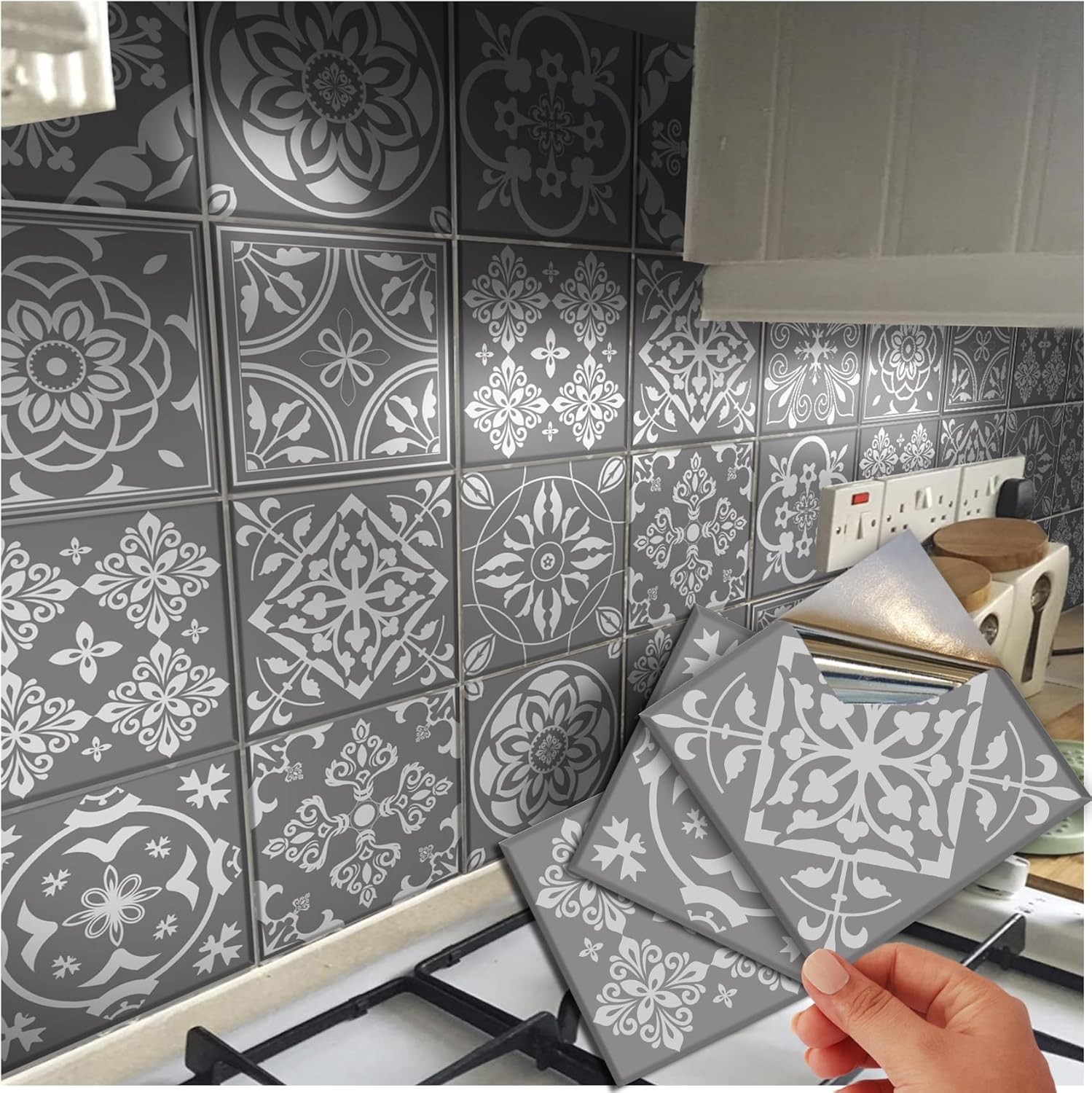 72 Grey Tile Stickers Victorian Moroccan Mosaic Tile Transfers for 6x6inch 15x15cm Kitchen Bathroom Stick On Wall Peel N Stick Decals Shabby Chic Vintage Style (72 Individual Stickers)