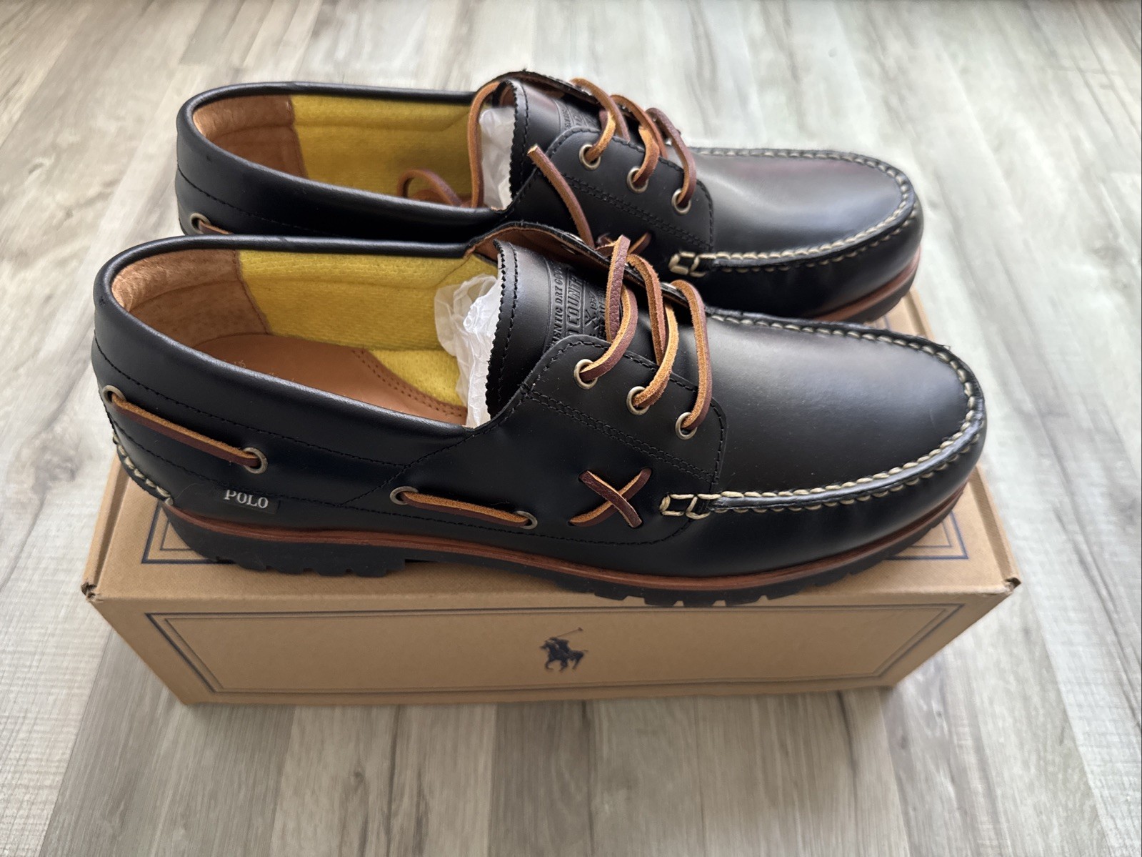 New Polo Ralph Lauren Men Ranger Deck 3-Eye Black Leather Boat Shoes Size UK 11D
