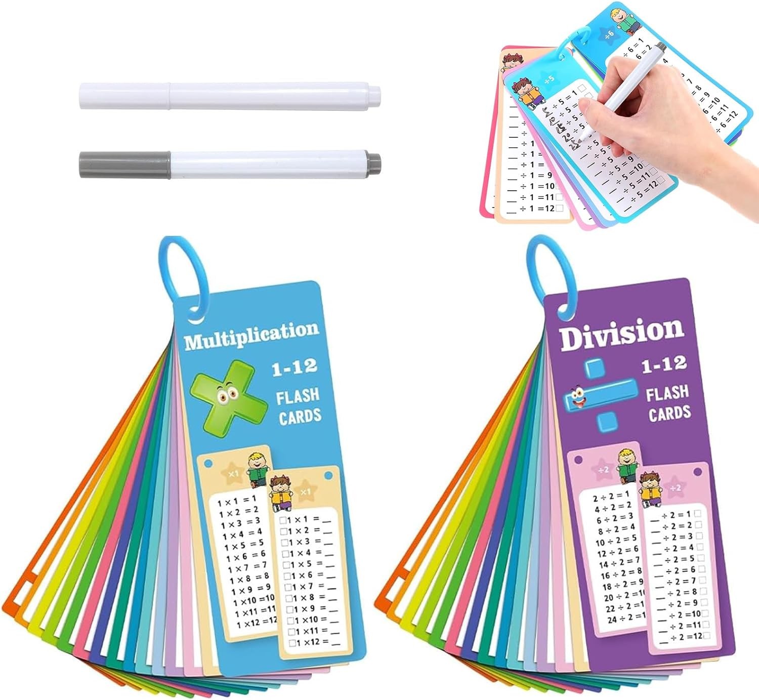 GSrenyu Times Table Multiplication Flash Cards, 0-12 Multiplication Chart Division Flashcards With Times Tables Poster, 2 Dry Erase Markers and 2 Ring Math Flash Card For Kids