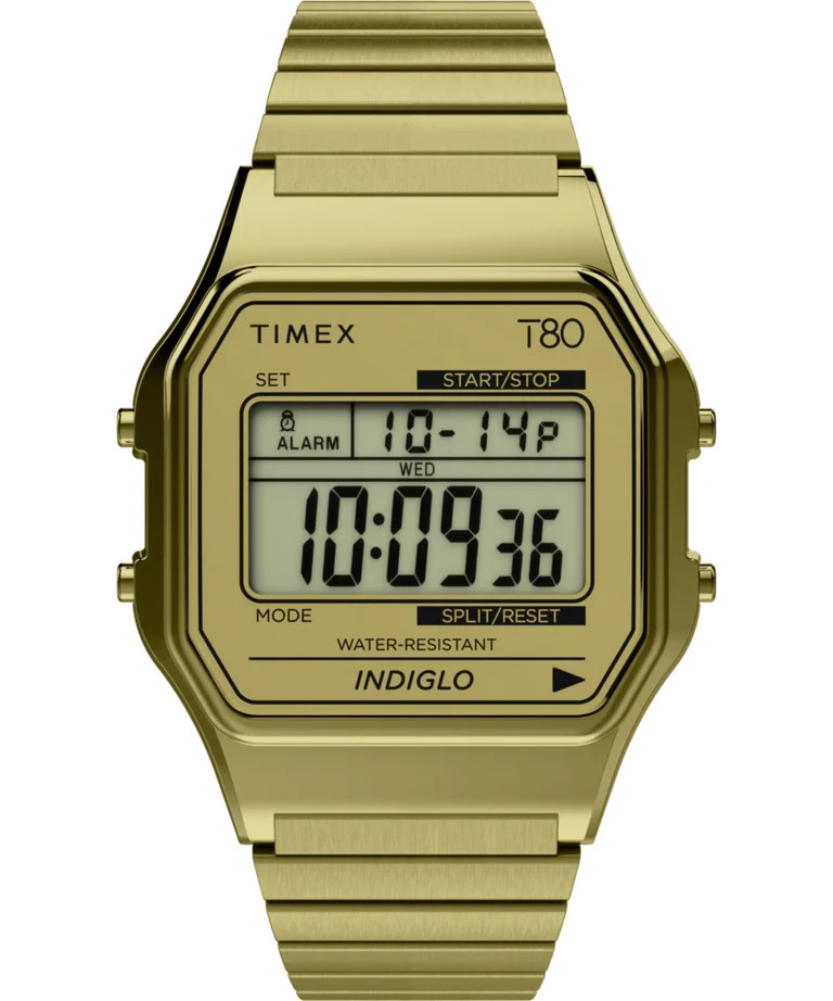 Original Timex T80 Retro Style Gold Digital Indiglo 34mm Watch TW2W68100