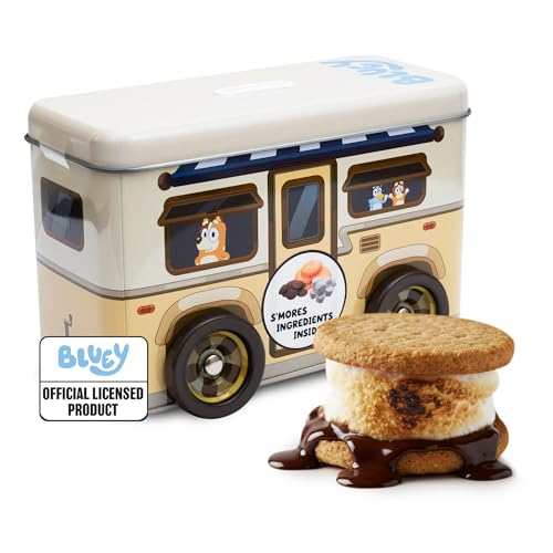 Bluey Money Tin Piggy Bank & S'mores Hamper Gift Set - Wheeled Money Box with Giant Marshmallows, Dark Chocolate Buttons & Digestive Biscuits - Christmas Treats for Kids, Girls, Boys Bluey Gifts