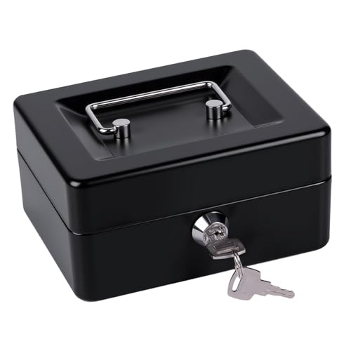 Money Tin Box with Key, Portable Cash Box with Coin Tray, Small Cash Tin for Home, Office and Events (Black-small)