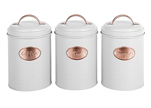 Novel Solutions Retro Round Tea, Sugar, Coffee Canisters 3pc Set with Lids. Decorative Kitchen Food Storage Tin for your favorite Tea bags, Sugar cubes and Coffee beans or powder.