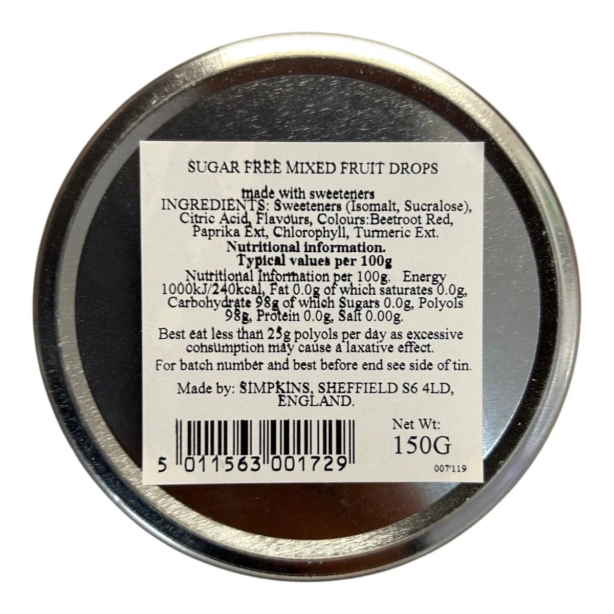 Simpkins Mixed Fruit SUGAR FREE Travel Sweets Tin 150g GET WELL SOON.