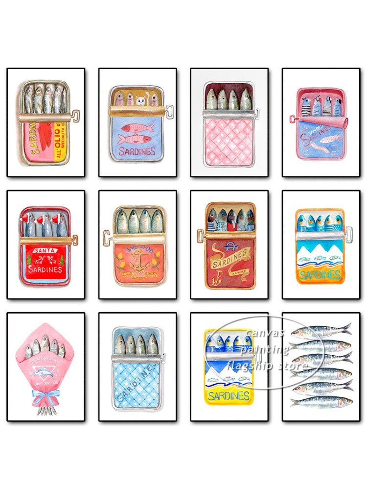 Fish Tinned Sardines Watercolor Vintage Poster Sardine Tin Foodie Gift Retro Food Canvas Printing Wall Art Trendy Kitchen Decor