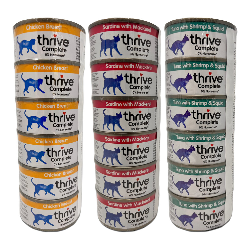 Thrive Cat Food Wet Complete Bundle: 18 Tinned Sets (6 x Sardine & Mackerel, 6 x Tuna with Shrimp & Squid, 6 x Chicken & Vegetables)