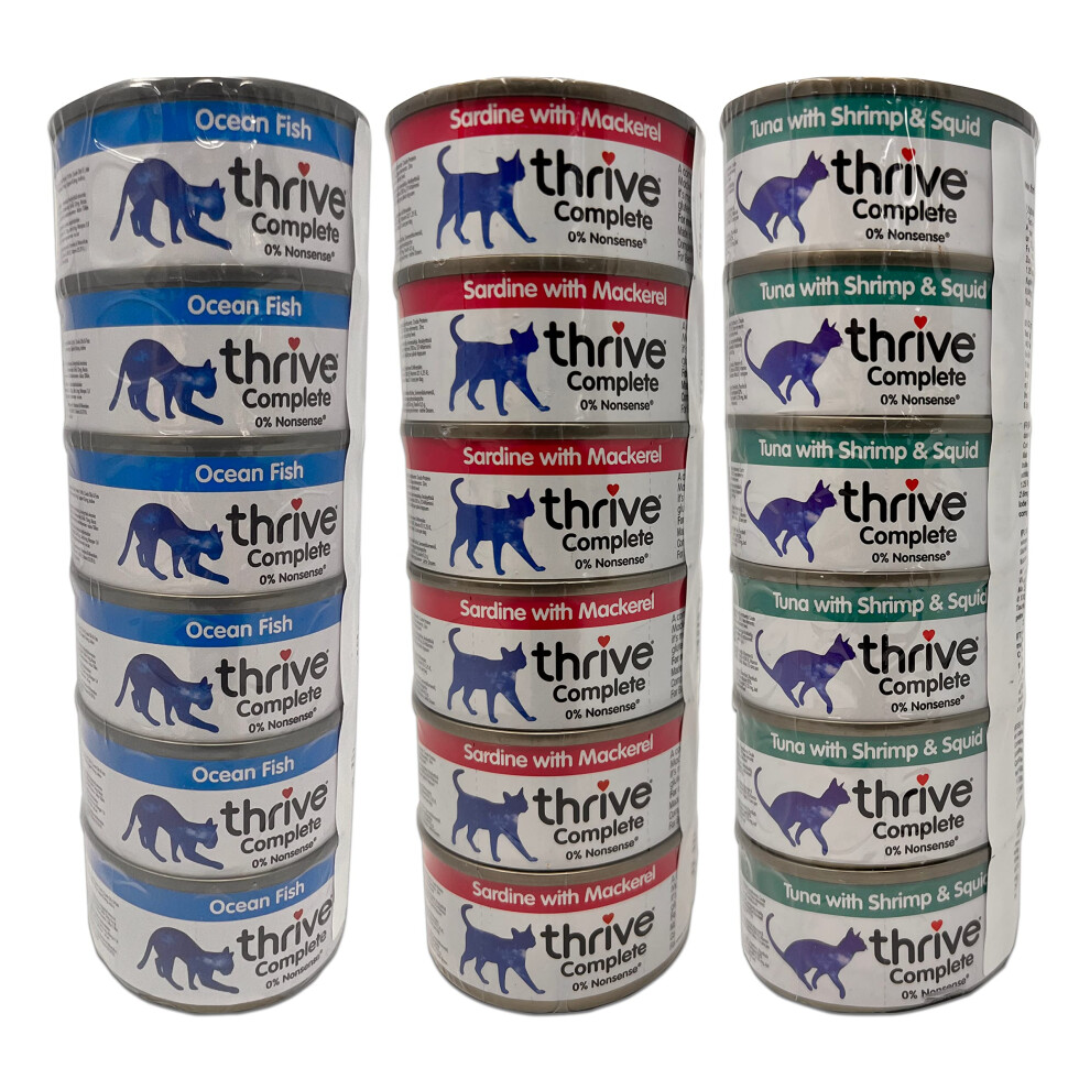 Thrive Cat Food Wet Complete Bundle - 18 Tinned Sets (6 x Ocean Fish, 6 x Sardine & Mackerel, 6 x Tuna With Shrimp & Squid) 75g Each
