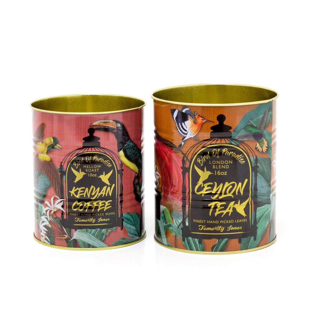 Set Of 2 Decorative Replica Tea & Coffee Tin Cans | Tropical Birds Storage Tins