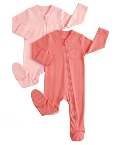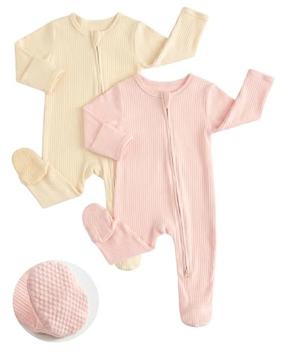 JiAmy Baby Grows Sleepsuits, Tiny Baby 100% Cotton Two-Way Zip Long Sleeve Footed Pajamas with Mitten Cuffs Pink Beige 3-6 Months