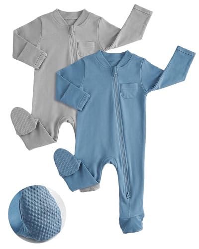 JiAmy Baby Grows Sleepsuits, Tiny Baby 100% Cotton Two-Way Zip Long Sleeve Footed Pajamas with Mitten Cuffs Blue Grey 3-6 Months