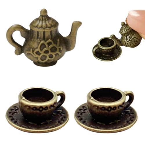 Pesoncarl Miniature Tea Set 1/12 Scale Vintage Realistic Mini Tea Set with Teapots & Teacups, Simple Delicate Tiny Alloy Cup for Dollhouse Kitchen Accessories Party Favour