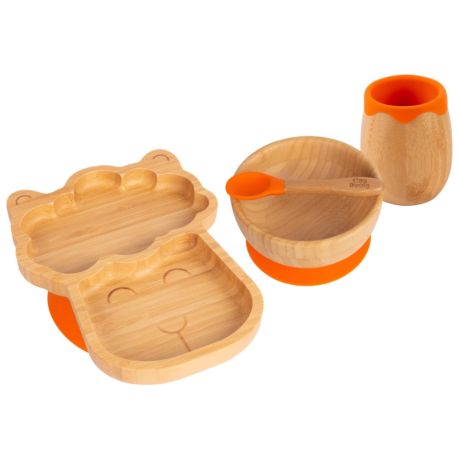 4pc Tiny Dining Orange Elephant Bamboo Baby Feeding Set Plate Bowl Spoon Cup