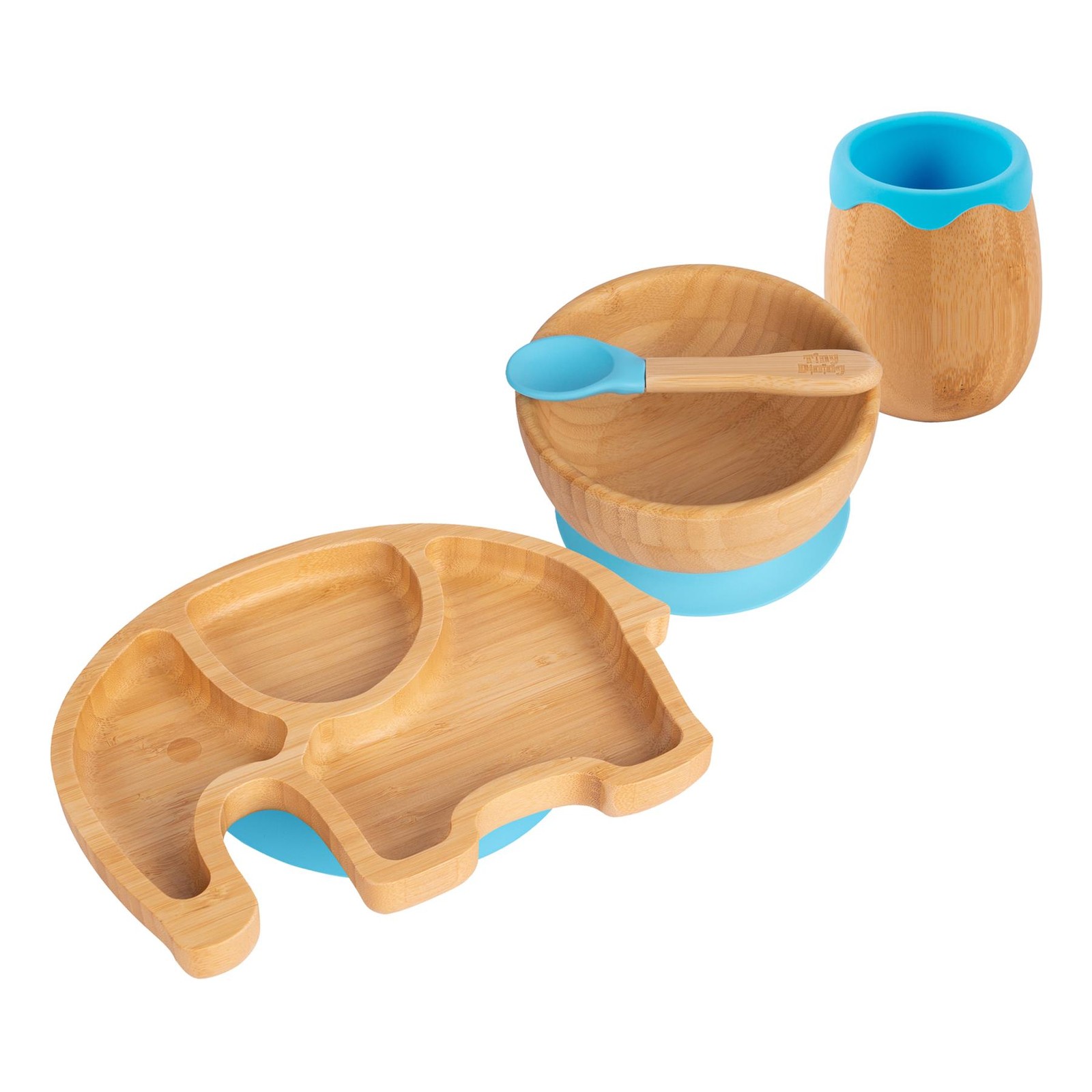 4pc Tiny Dining Blue Elephant Bamboo Baby Feeding Set Kids Plate Bowl Spoon Cup