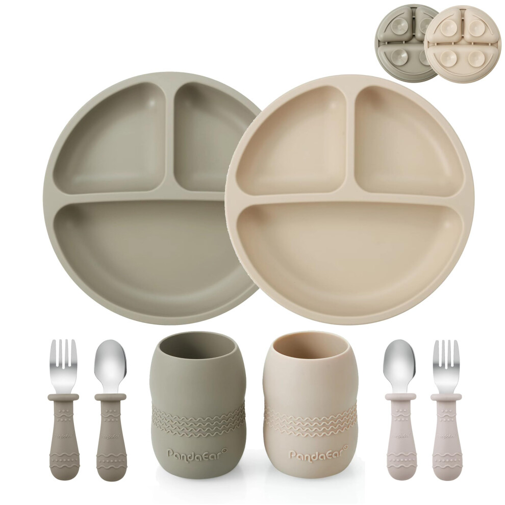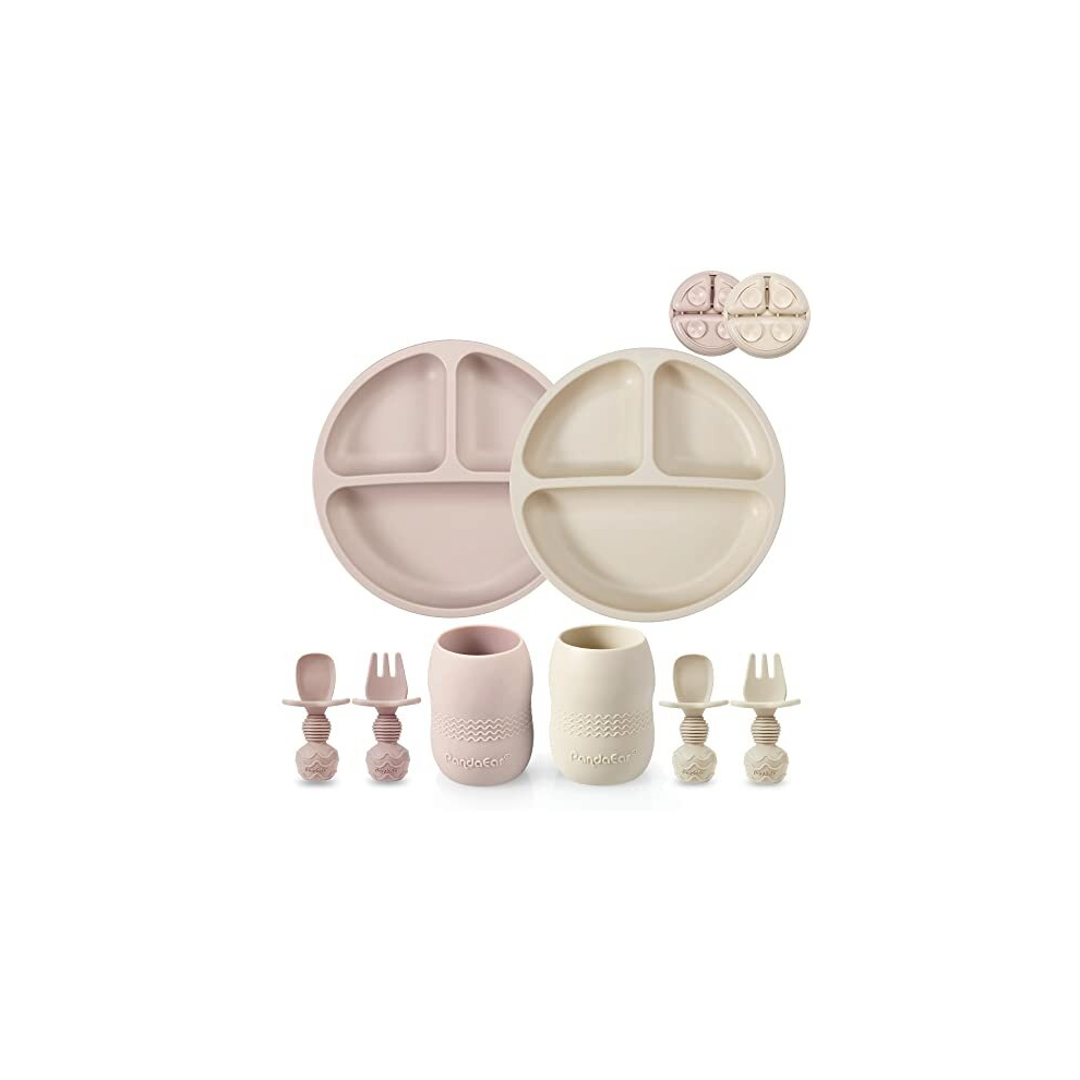 PandaEar Silicone Baby Feeding Set| 2 Pack Silicone Divided Suction Plate and 2 Pack Tiny Cup with 2 Spoons 2 Forks| Baby Led Weaning Supplies Self