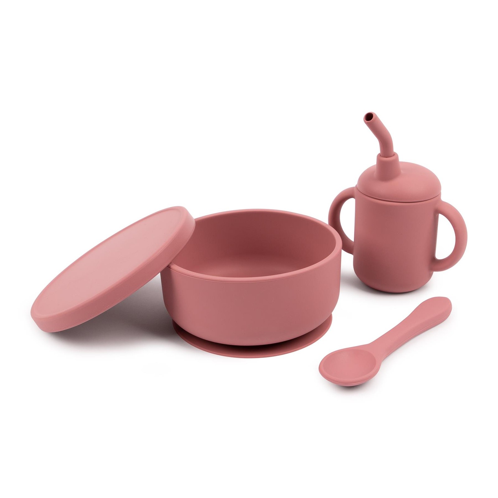 3pc Tiny Dining Dusty Rose Silicone Baby Feeding Set Suction Bowl Sippy Cup