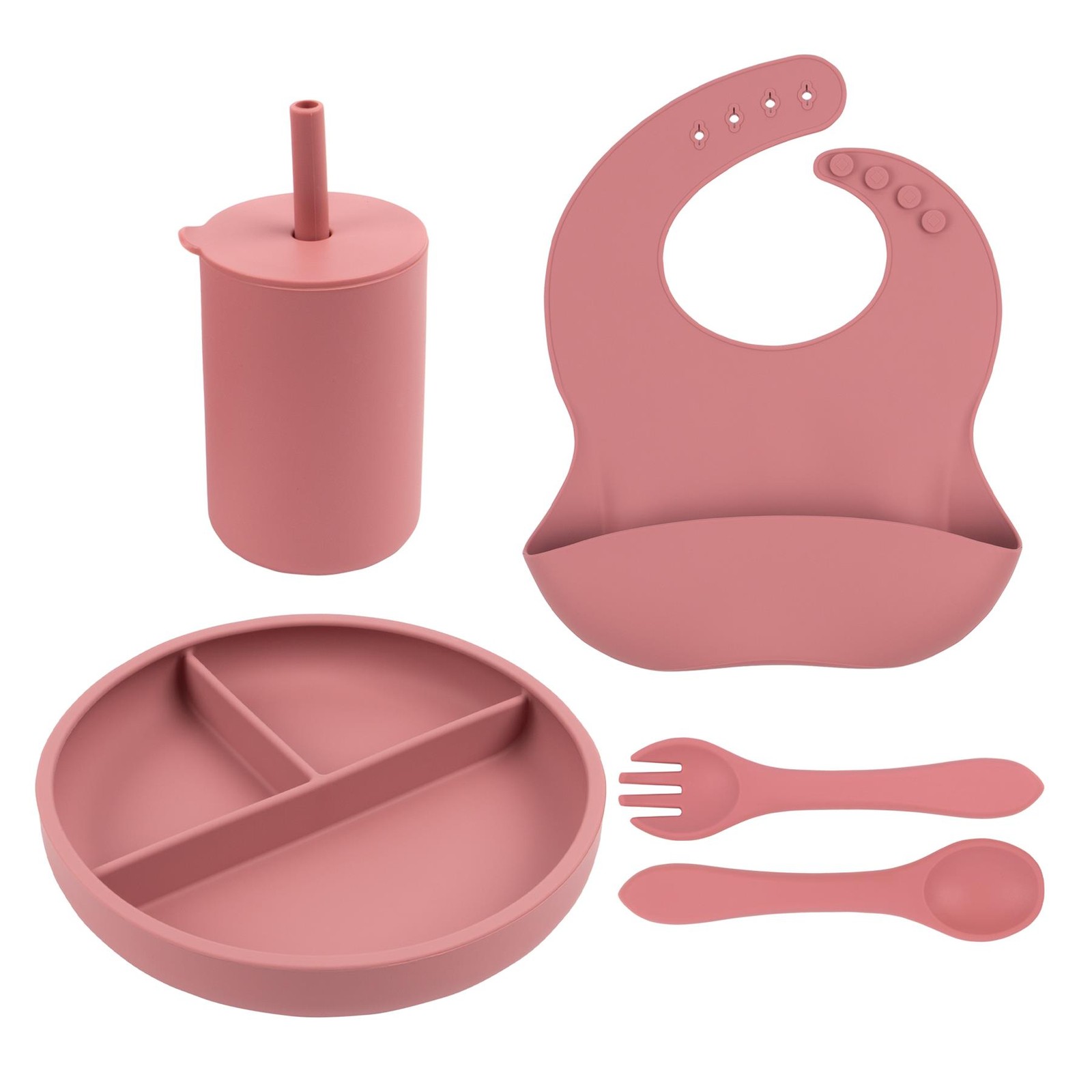 5pc Tiny Dining Dusty Rose Silicone Baby Feeding Set Bib Plate Spoon Fork Cup