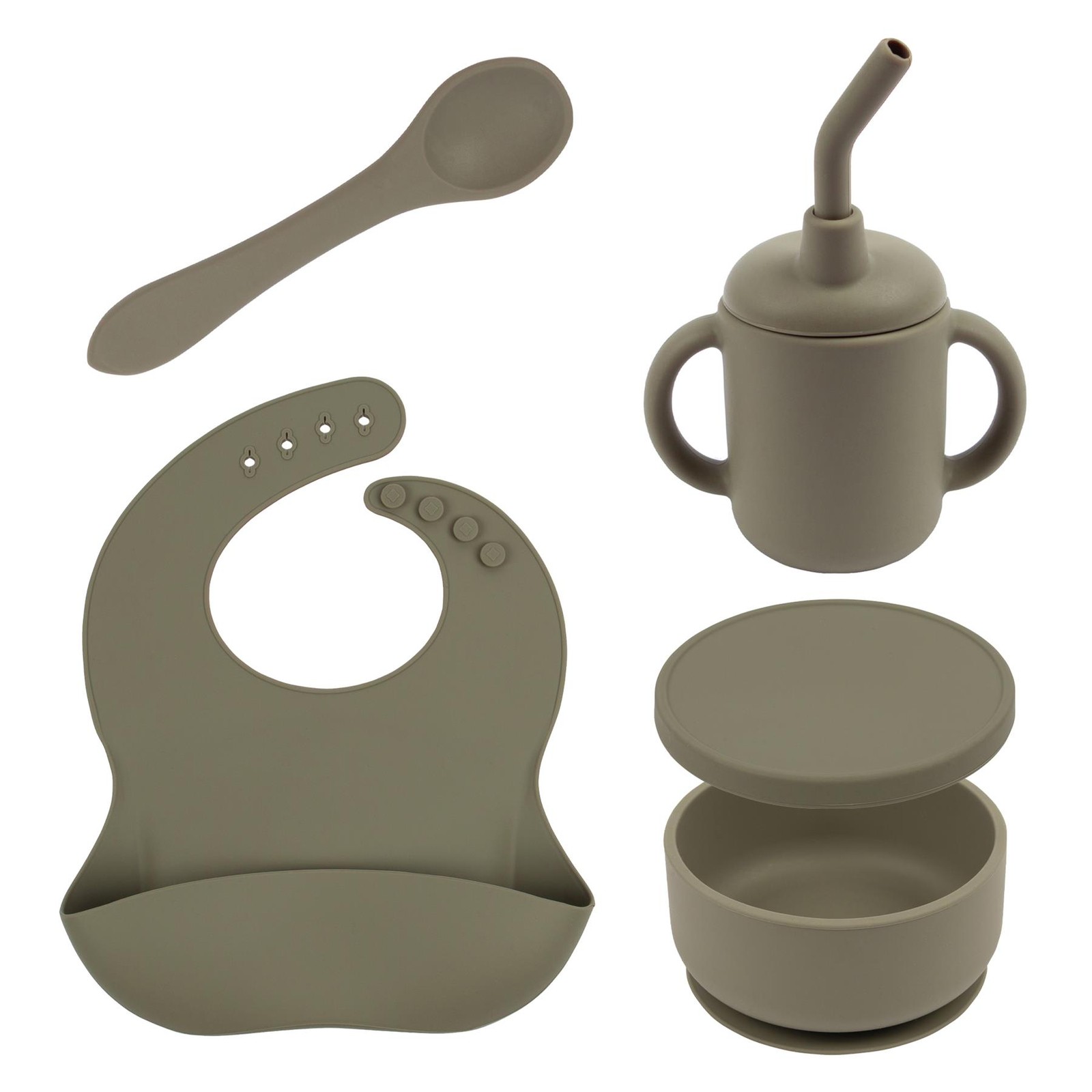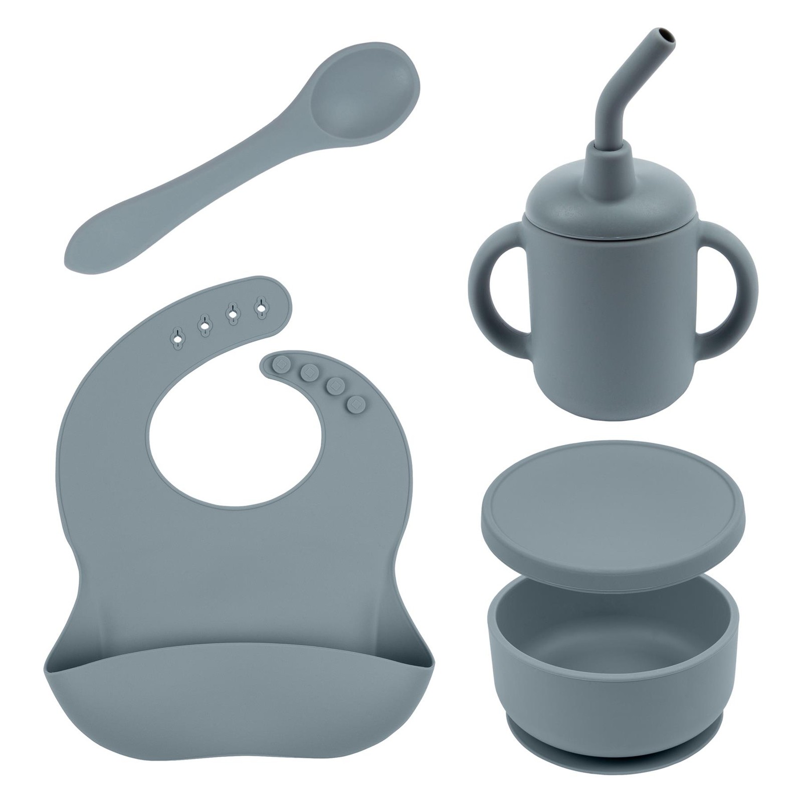 4pc Tiny Dining Silver Sage Silicone Baby Feeding Set Kids Bib Bowl Spoon Cup