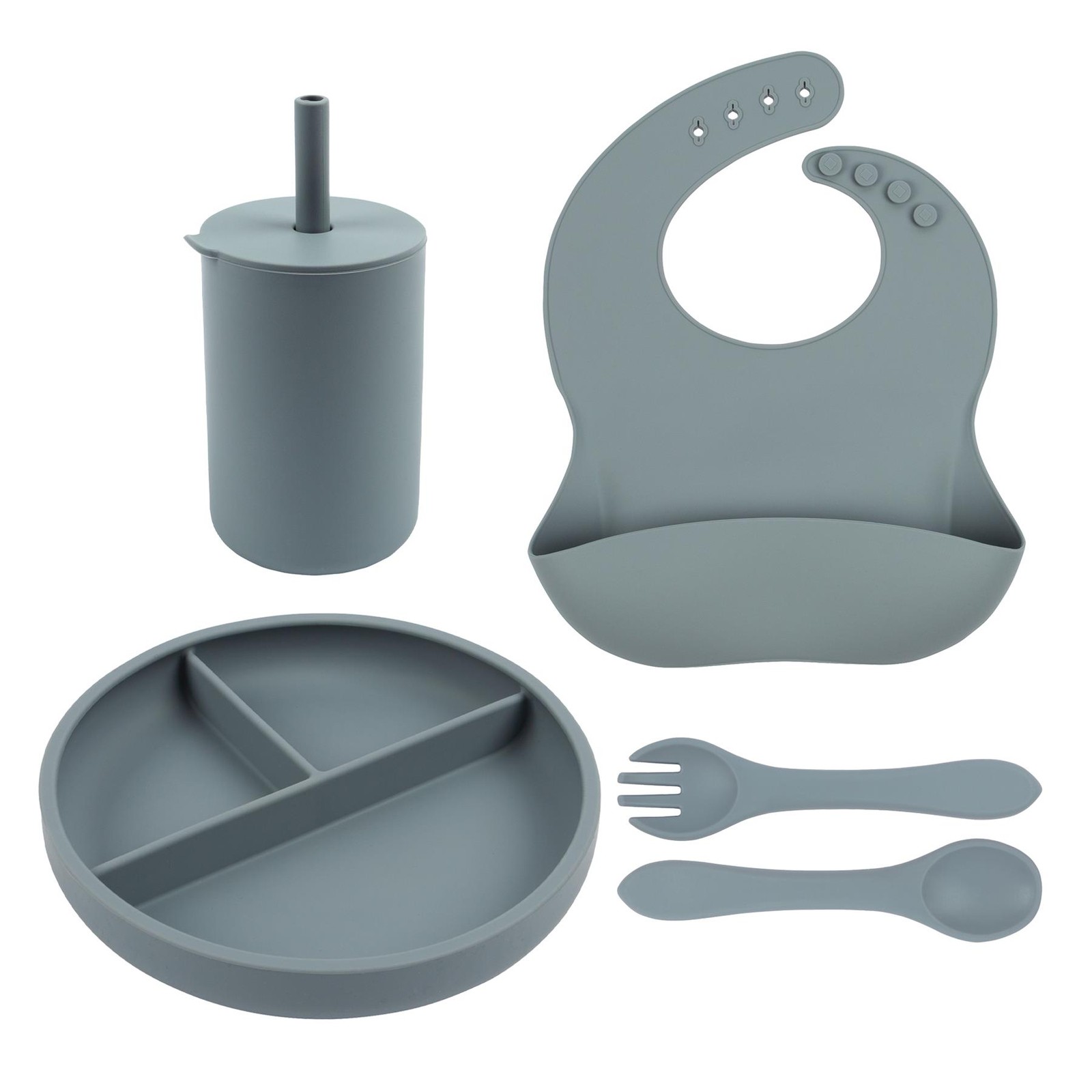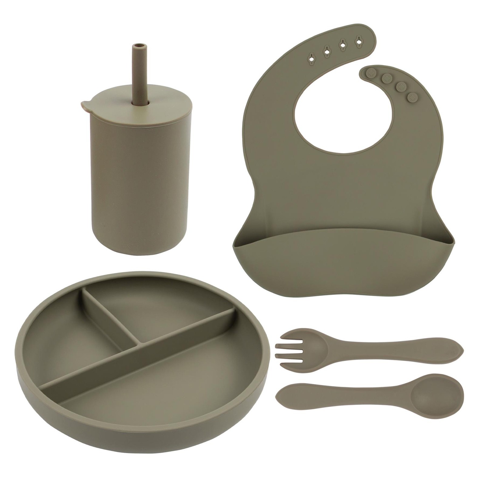 5pc Tiny Dining Silver Sage Silicone Baby Feeding Set Bib Plate Spoon Fork Cup