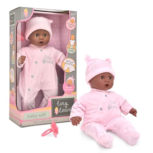 John Adams Tiny Tears Baby Soft Doll 15" (38 cm) - Black/Dark Skin | Soft Bodied Baby with Closing Eyes & Dummy | Deluxe Pink Outfit | Cuddly First Doll Set | Toy for Toddlers Age 10 Months+